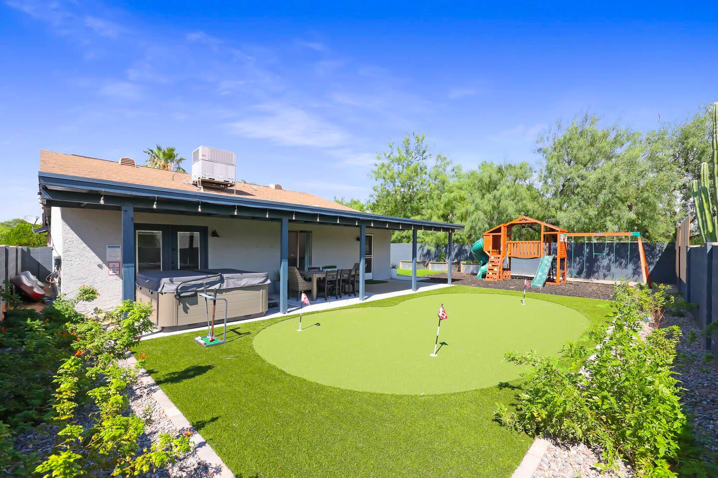 Impossible not to have a great time at this golfer's getaway home 5 minutes from top shopping, dining, and golfing. Includes: - Hot tub - Grill & outdoor dining/lounge spaces - Smart TVs in every bedroom and living room - YouTube TV - Playground, basketball hoop & putting green - Coffee/espresso bar - Dog friendly - Hi-speed WiFi - Washer/dryer - King-sized bed - RV gate w/electrical hookup No partiers please. If you want a fun, relaxing weekend w/family & friends, we'd love to host you!
