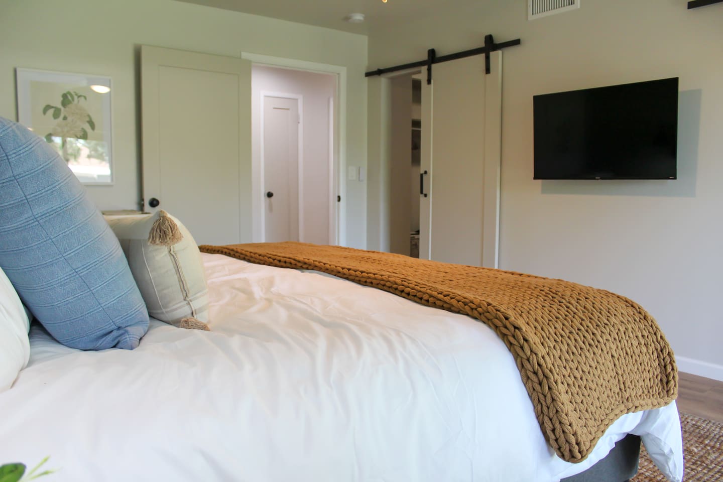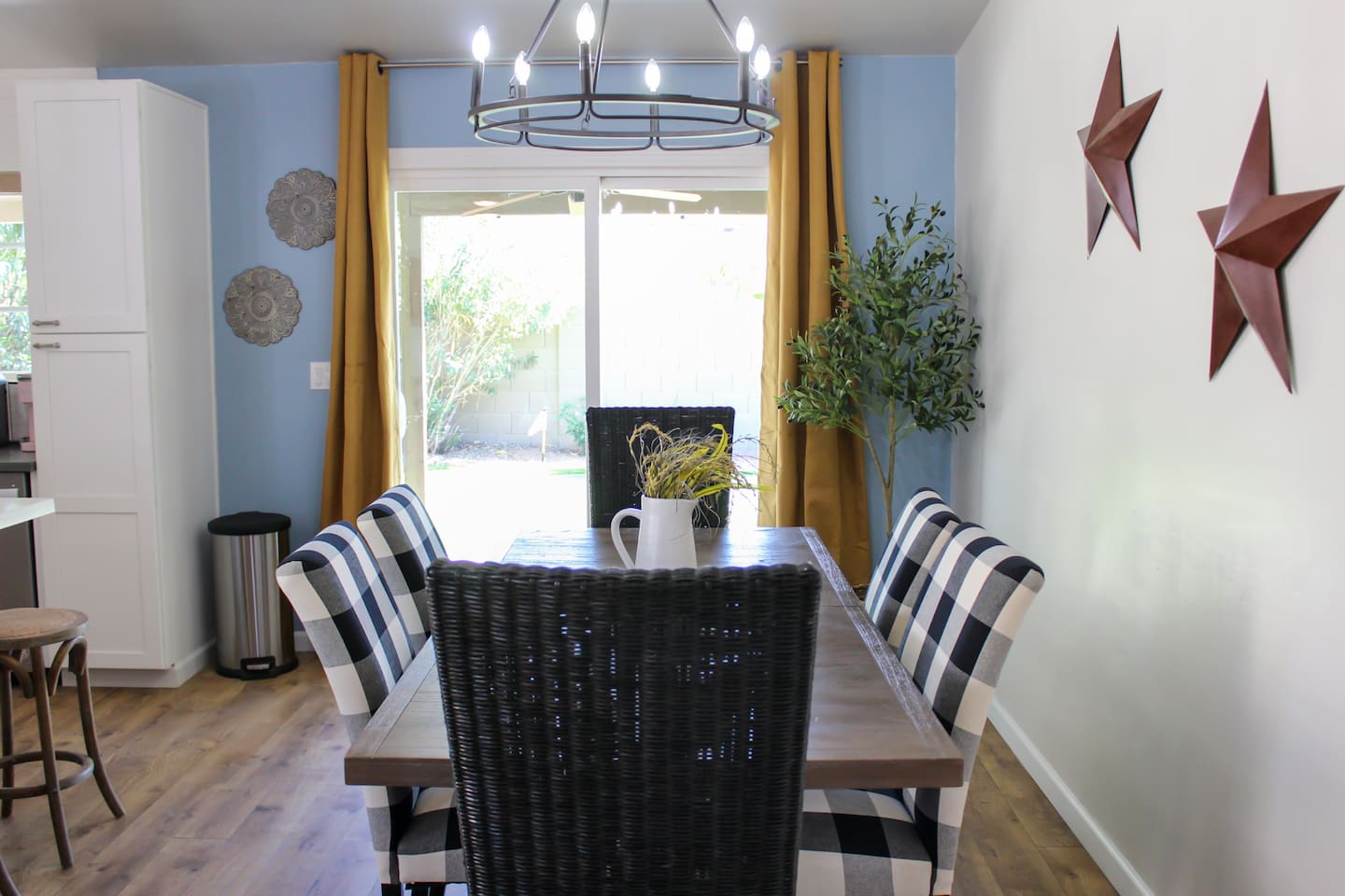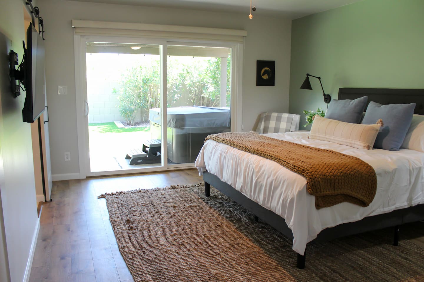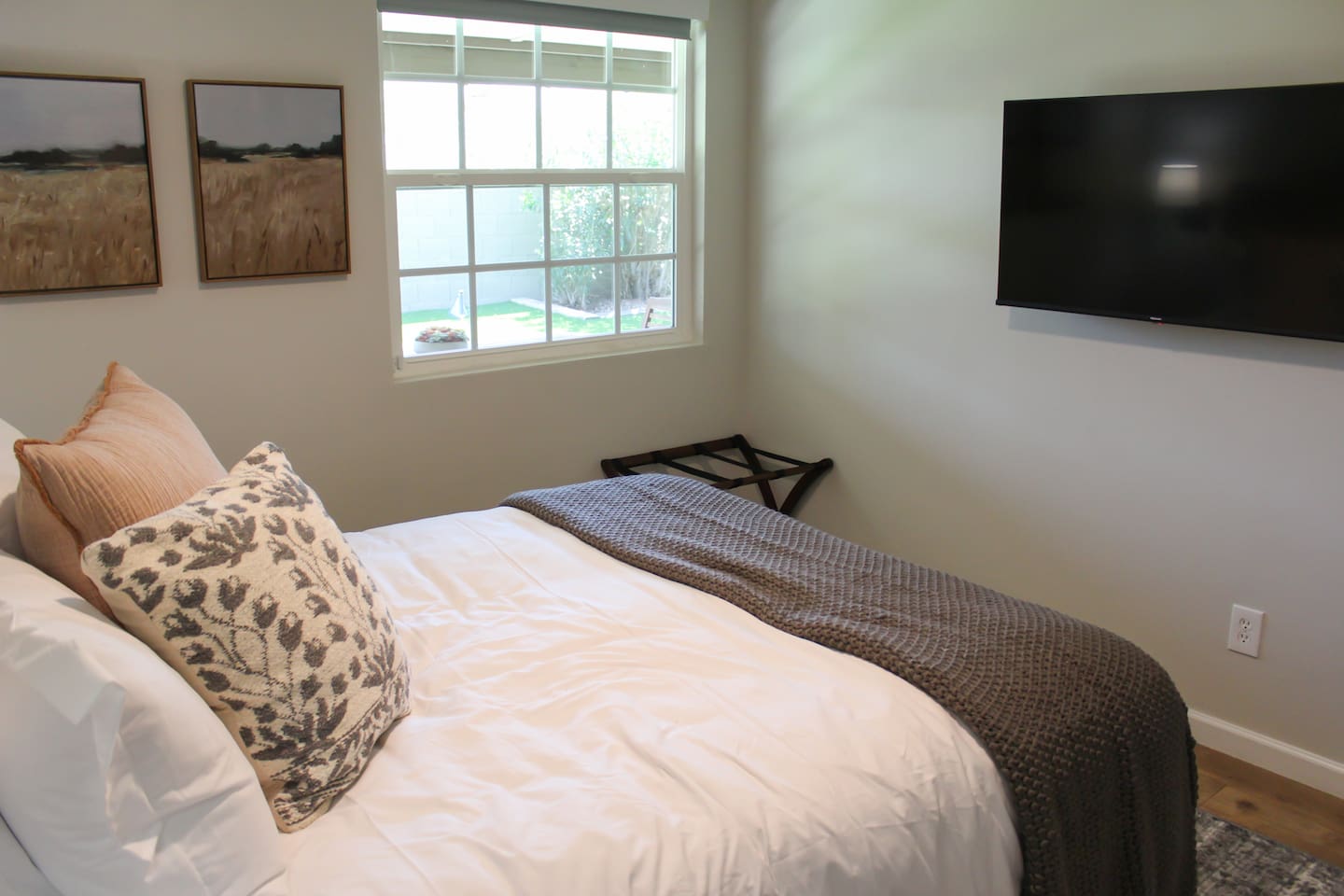 LIVING ROOM AND KITCHEN: The roomy living area features a huge sectional with plenty of additional seating around the big-screen TV. There's a record player (Beatles-themed, of course!) and kids toys & books so everyone can be entertained. The living room flows into the kitchen and dining area. The kitchen is newly remodeled and full of amenities including a coffee bar where you can make yourself some espresso or drip coffee! You'll have everything you need and enjoy eating in the comfy dining chairs or on the bar stools at the island. OUTDOORS: More fun outside awaits! Soak in the Jacuzzi, practice your putting, or compete at cornhole. You can enjoy the shade under the covered patio complete with a dining set and end the night relaxing on the front porch with 2 wooden rocking chairs. Kids will have plenty to do outside too with a play kitchen, dining table, and Velcro darts. Grill up some burgers and dogs with the charcoal grill and end the night around the fire pit. There is something for everyone! BEDROOMS: Each bedroom is equipped with amazing bedding, pillows, and its own unique flair. You will have everything you need, including 4K TVs with YouTube TV, luggage racks, and hangers. Two of the bedrooms even have a desk and chair for remote workers. BATHROOMS: The bathrooms are newly renovated and a delight to use! They have all the amenities you'd expect and more.