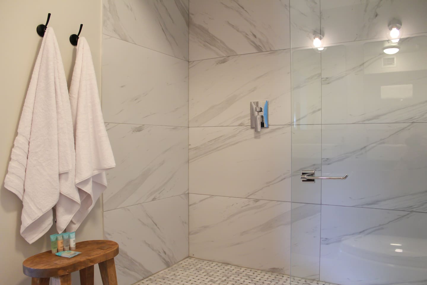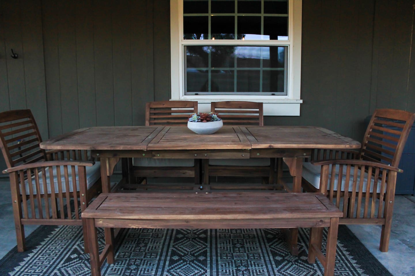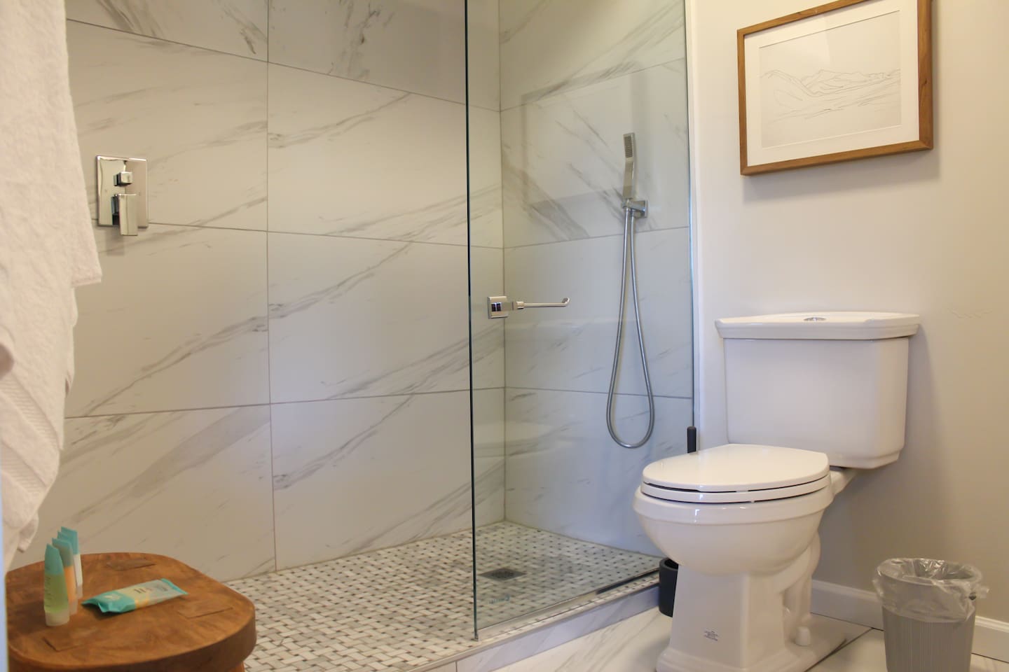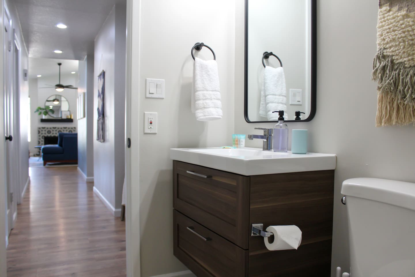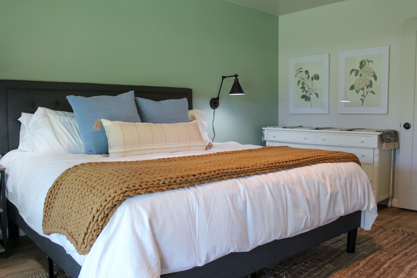 LIVING ROOM AND KITCHEN: The roomy living area features a huge sectional with plenty of additional seating around the big-screen TV. There's a record player (Beatles-themed, of course!) and kids toys & books so everyone can be entertained. The living room flows into the kitchen and dining area. The kitchen is newly remodeled and full of amenities including a coffee bar where you can make yourself some espresso or drip coffee! You'll have everything you need and enjoy eating in the comfy dining chairs or on the bar stools at the island. OUTDOORS: More fun outside awaits! Soak in the Jacuzzi, practice your putting, or compete at cornhole. You can enjoy the shade under the covered patio complete with a dining set and end the night relaxing on the front porch with 2 wooden rocking chairs. Kids will have plenty to do outside too with a play kitchen, dining table, and Velcro darts. Grill up some burgers and dogs with the charcoal grill and end the night around the fire pit. There is something for everyone! BEDROOMS: Each bedroom is equipped with amazing bedding, pillows, and its own unique flair. You will have everything you need, including 4K TVs with YouTube TV, luggage racks, and hangers. Two of the bedrooms even have a desk and chair for remote workers. BATHROOMS: The bathrooms are newly renovated and a delight to use! They have all the amenities you'd expect and more.